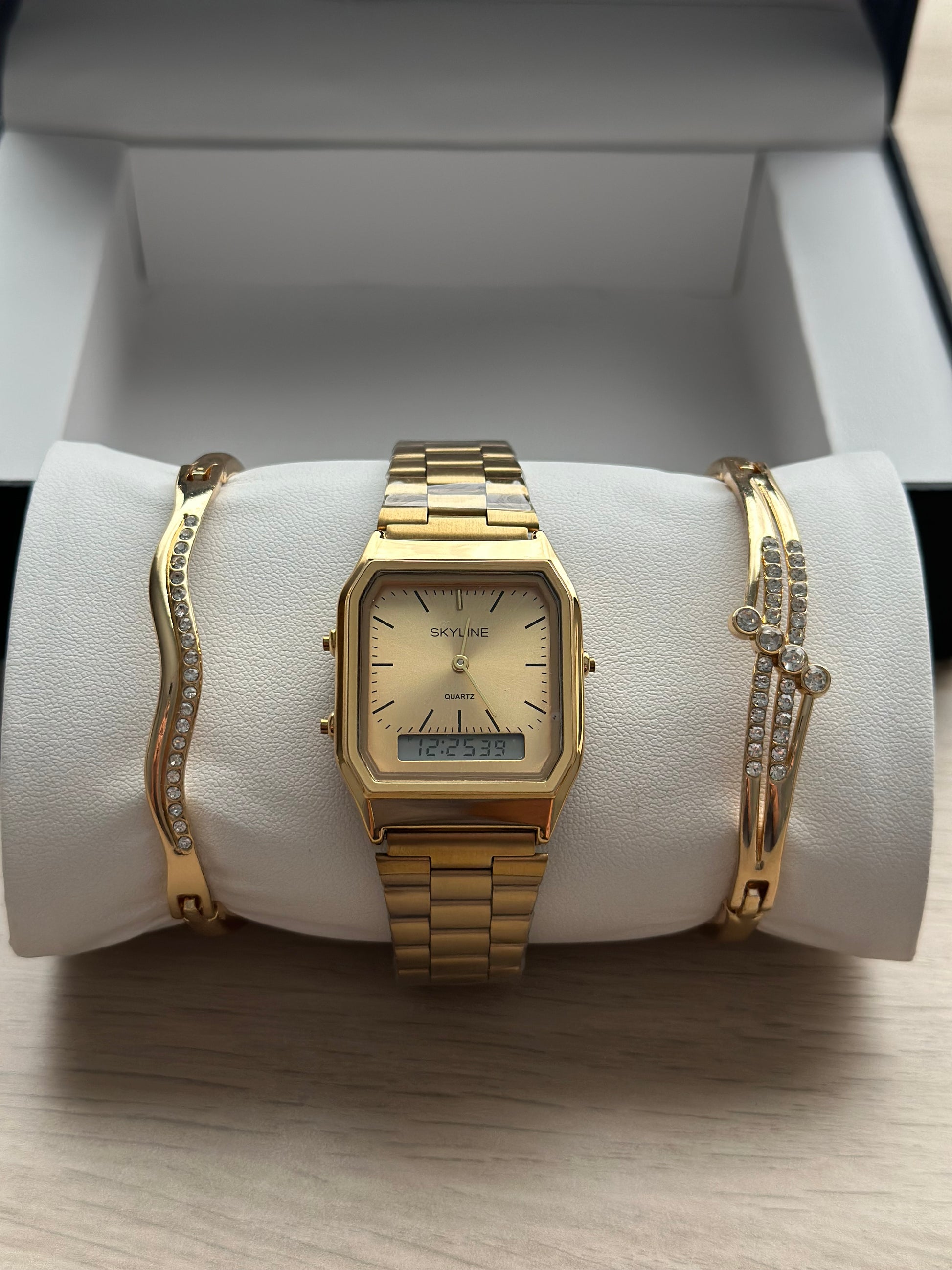 - Incluye: 1 reloj SKYLINE + 2 brazaletes dorados de regalo